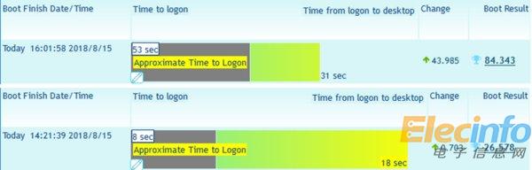 機械硬盤進入操作系統到啟動程序、桌面完全準備完畢需耗時84.343秒。開啟傲騰加速技術后,只需26.578秒就可完成任務