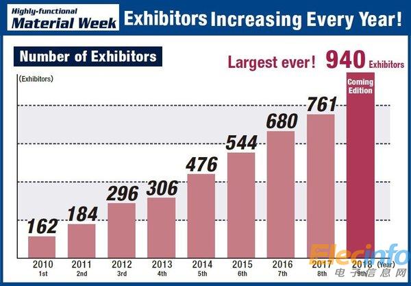 日本高性能材料周的規模逐年擴大,今年將迎來940家參展商,比上屆展覽會增加180家。此外,第28屆FINETECH JAPAN - LCD/OLED/傳感技術展和Photonix 2018 - 激光/光學技術展將作為同期展會在同一地點舉行。在這8場展覽會中,預計將有來自51個國家的1,260家參展商和65,000名觀眾齊聚一堂。