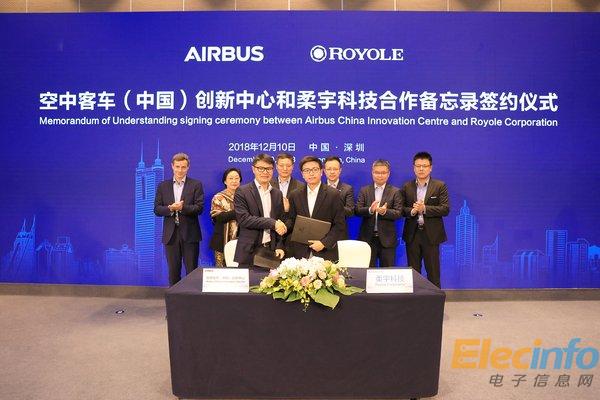 2018年12月10日,柔宇科技有限公司(Royole Corporation)與空中客車中國創新中心(Airbus China Innovation Centre,ACIC)在深圳正式簽署戰略合作備忘錄,雙方將就柔性電子技術在飛機客艙等場景的應用和商業合作開展研究。空中客車中國公司CEO徐崗、柔宇科技董事長兼CEO劉自鴻、空中客車中國創新中心CEO羅崗等出席簽約儀式。