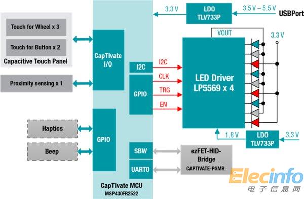 圖 1:電容式觸控和LED動畫參考設計的框圖(圖片來源于德州儀器)