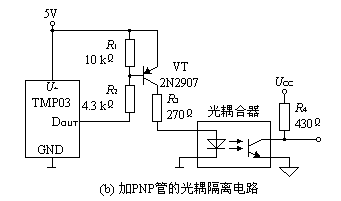 (a)圖為普通光耦隔離電路。TMP03能夠承受5 mA以下的灌電流,可直接與光耦中LED發光二極管的陰極連通。此時上拉電阻 R1還起到限流作用,防止LED過流損壞。取 R1=620歐姆,當DOUT端呈低電平時,灌電流小于1 mA,LED上的正向壓降僅為1 V左右。需要注意的是,光耦合器的開啟和關閉時間必須完全相同,否則會導致被傳輸的數據 發生錯誤。某些達林頓型光耦合器(例如4N32)的開啟時間遠大于關閉時間,不能在此使用。