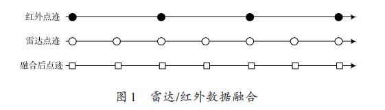 本文綜合應用點跡合并方法和點跡串行處理方法,搭建毫米波雷達和紅外數(shù)據(jù)融合的多傳感器平臺。假設雷達的掃描周期為5 ms,紅外的掃描周期為10 ms,所以首先將雷達和紅外點跡數(shù)據(jù)串行合并成為點跡數(shù)據(jù)流,進行點跡-航跡相關;對于在10 ms時刻,若雷達點跡和多個紅外點跡均與航跡相關上,則對這些點跡進行點跡壓縮合并,如圖1所示。